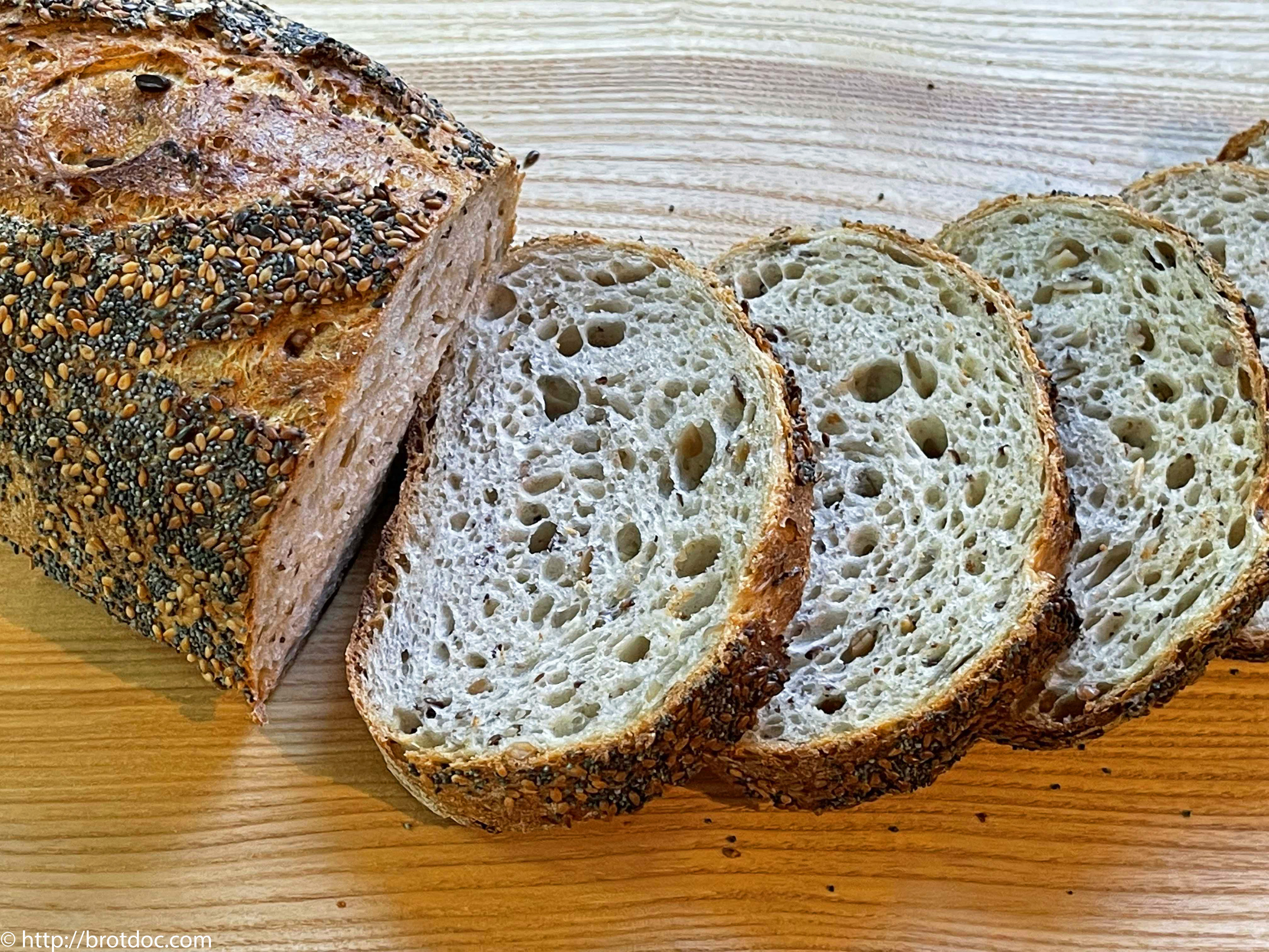 Die Verwendung von Schweineschmalz ist ein anderer kleiner Kniff, der sich mir erst in der Vorbereitung der Buchrezepte erschlossen hat. Es enthält offenbar natürliche Emulgatoren und Enzyme, die für ein deutlich größeres Brotvolumen sorgen. Die obige Krume spricht, trotz der relativ niedrigen TA und kurzen Reifezeit Bände, wie ich finde. Natürlich ist es nicht jedermanns Sache, ich weiß. Ich finde allerdings, dass bei Zugabemengen von 2-3 Prozent der Geschmack im Endergebnis nicht wirklich zuvor tritt.